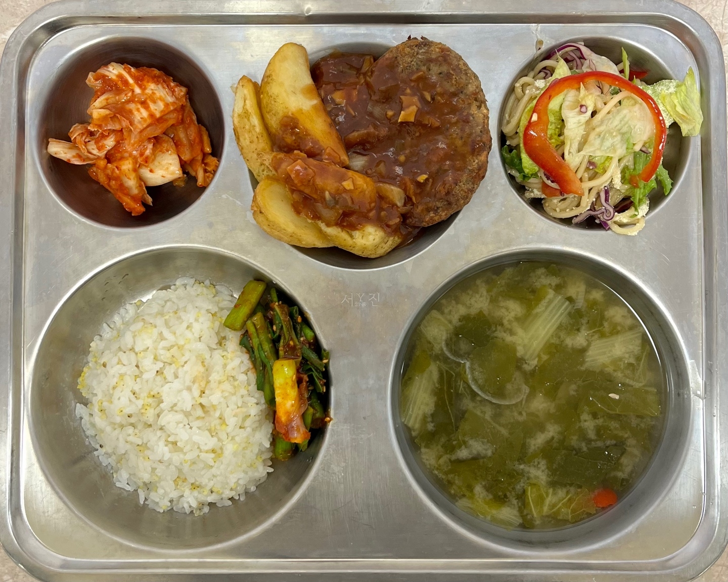 중식 : 찹쌀기장밥, 시락국, 함박스테이크/웨지감자, 파스타샐러드, 풋마늘고추장무침, 배추김치