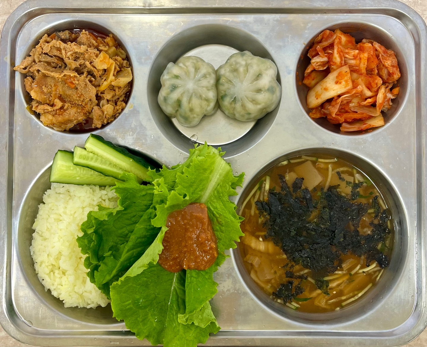 중식 : 강황밥, 도토리묵냉국, 돈육고추장불고기, 찰보리감자만두, 상추쌈&오이스틱/쌈장, 배추김치