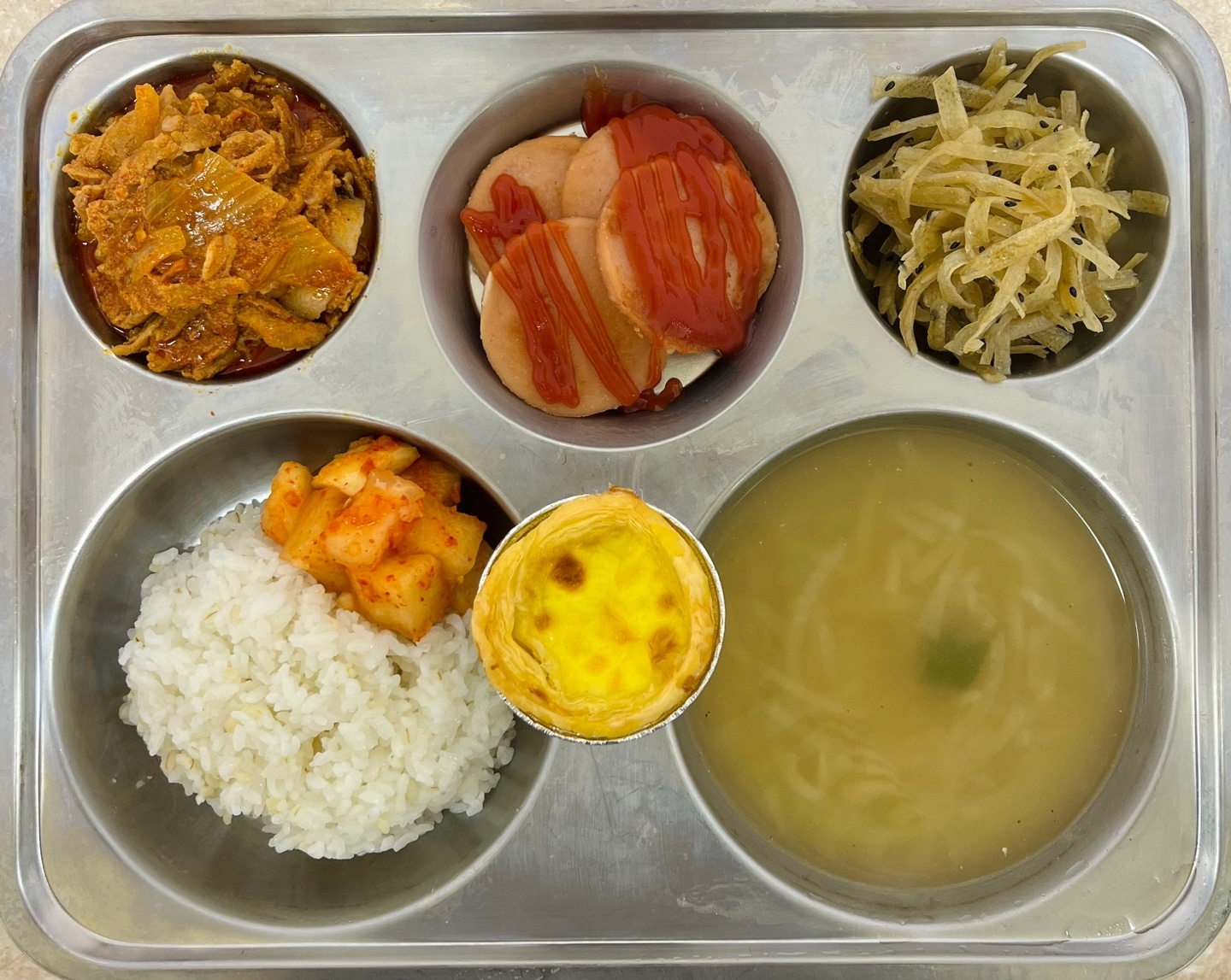 중식 : 찰보리밥, 들깨무채국, 돈육김치볶음, 옛날소시지전, 명채조림, 에그타르트, 깍두기