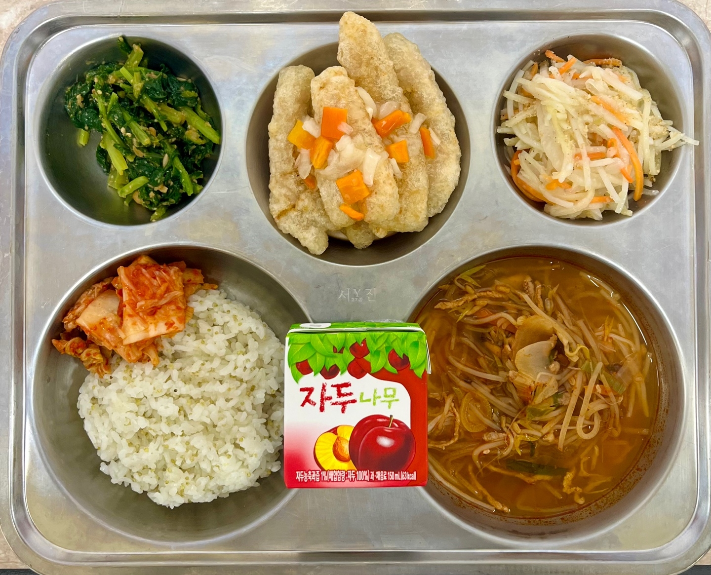 중식 : 찹쌀차조밥, 짬뽕쌀국수, 레몬소스찹쌀탕수육, 감자채볶음, 열무된장무침, 배추김치, 자두주스