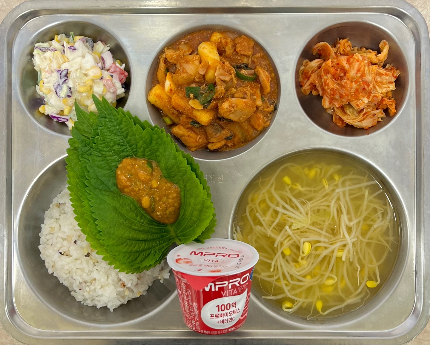 중식 : 찰혼합잡곡밥, 맑은콩나물국, 쌈장닭갈비, 콘샐러드, 깻잎쌈/쌈장, 배추김치, 떠먹는요구르트(딸기)