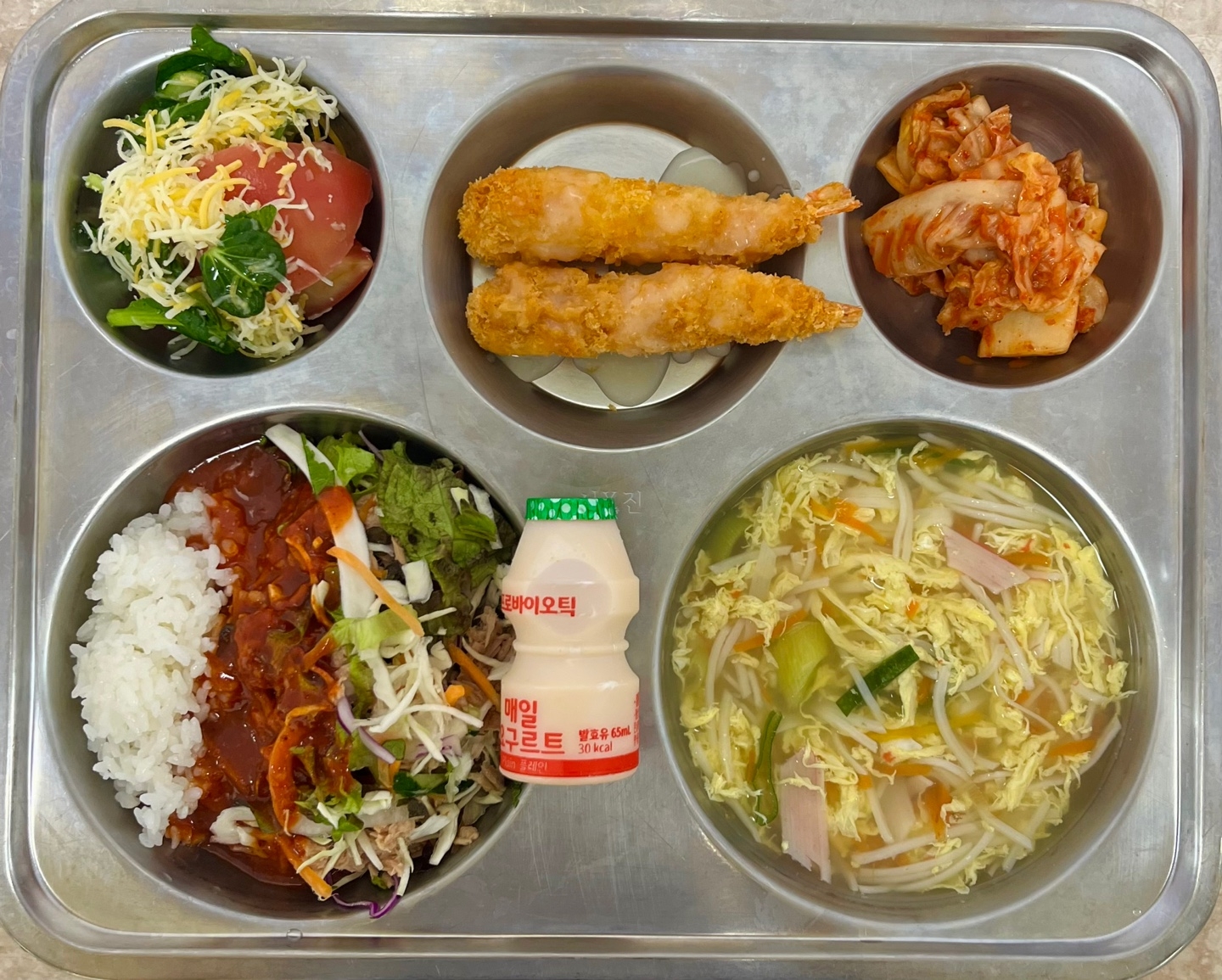 중식 : 참치비빔밥, 크래미계란국, 새우튀김, 크림마요, 꿀치즈토마토, 배추김치, 요구르트