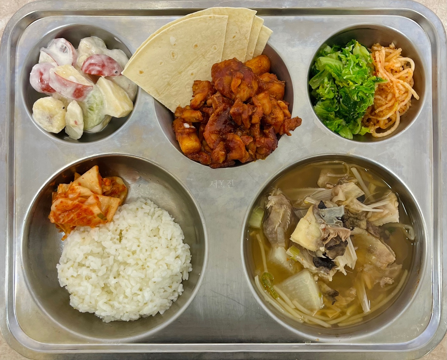 중식 : 찹쌀차조밥, 아귀탕, 닭바베큐&또띠아쌈, 생크림과일샐러드, 무생채, 단배추나물, 배추김치