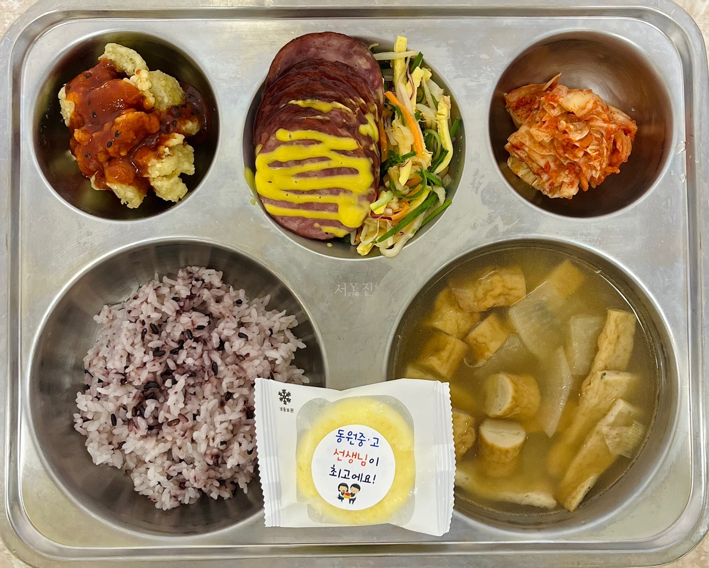 중식 : 찰흑미밥, 종합어묵국, 싸먹는 오리오절판, 매운코다리살강정, 배추김치, 크림찹쌀떡