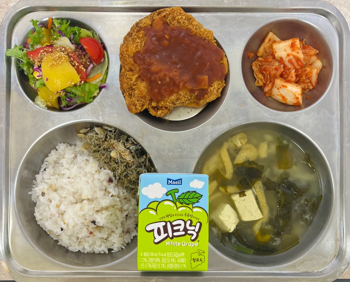 중식 : 찰혼합잡곡밥, 미소장국, 등심돈가스, 황도양상추샐러드/오리엔탈, 잔멸치아몬드볶음, 배추김치, 유산균음료(청포도)