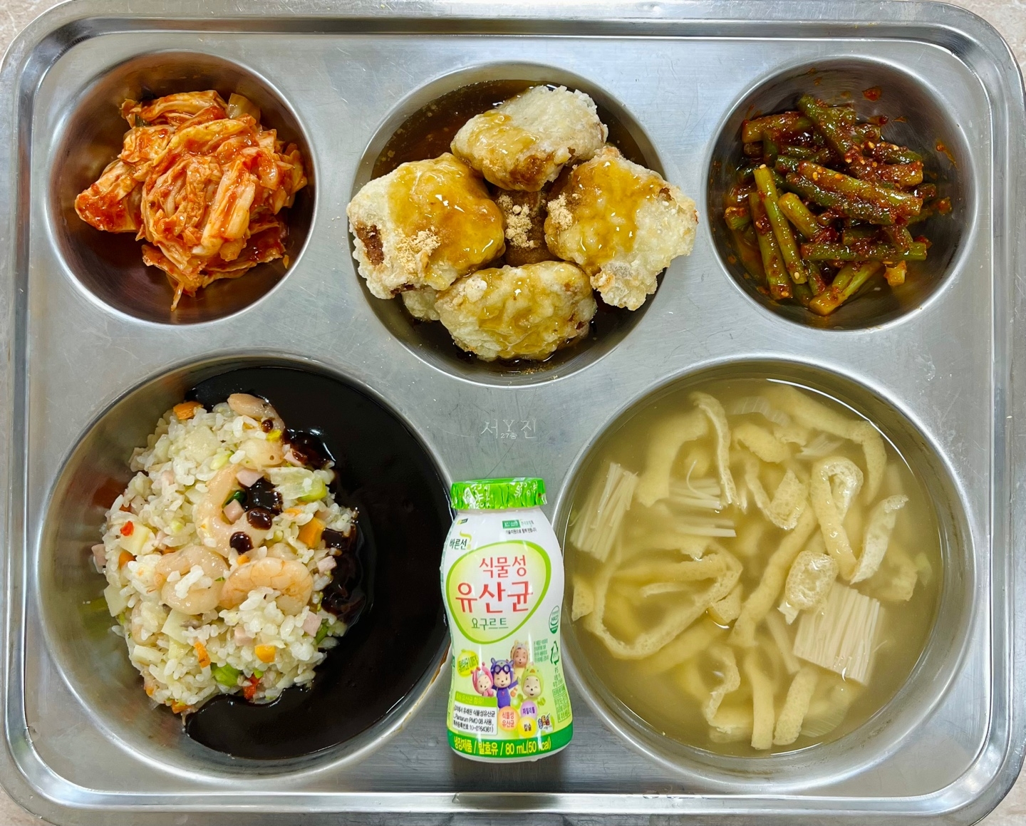 중식 : 중화식볶음밥/자장소스, 유부팽이맑은국, 콩고물뿌린 찹쌀궈바로우, 마늘쫑고추장무침, 배추김치, 요구르트