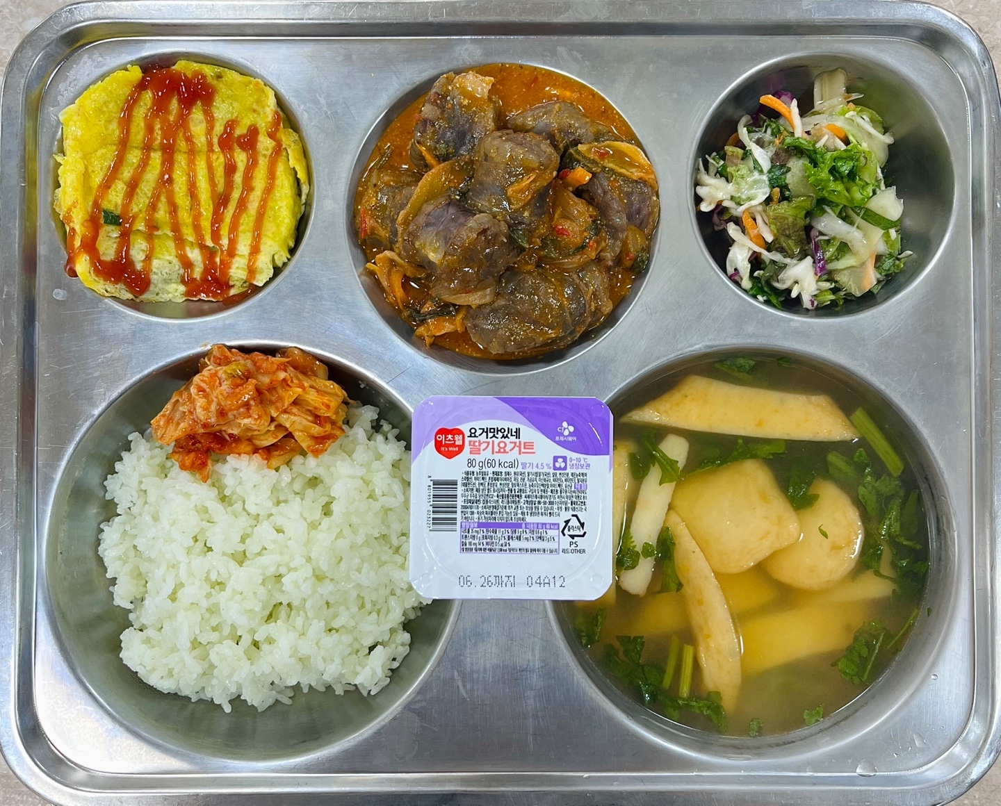 중식 : 클로렐라찹쌀밥, 어묵매운탕, 순대볶음, 달걀말이, 새콤상추치커리무침, 배추김치, 떠먹는요구르트(딸기)