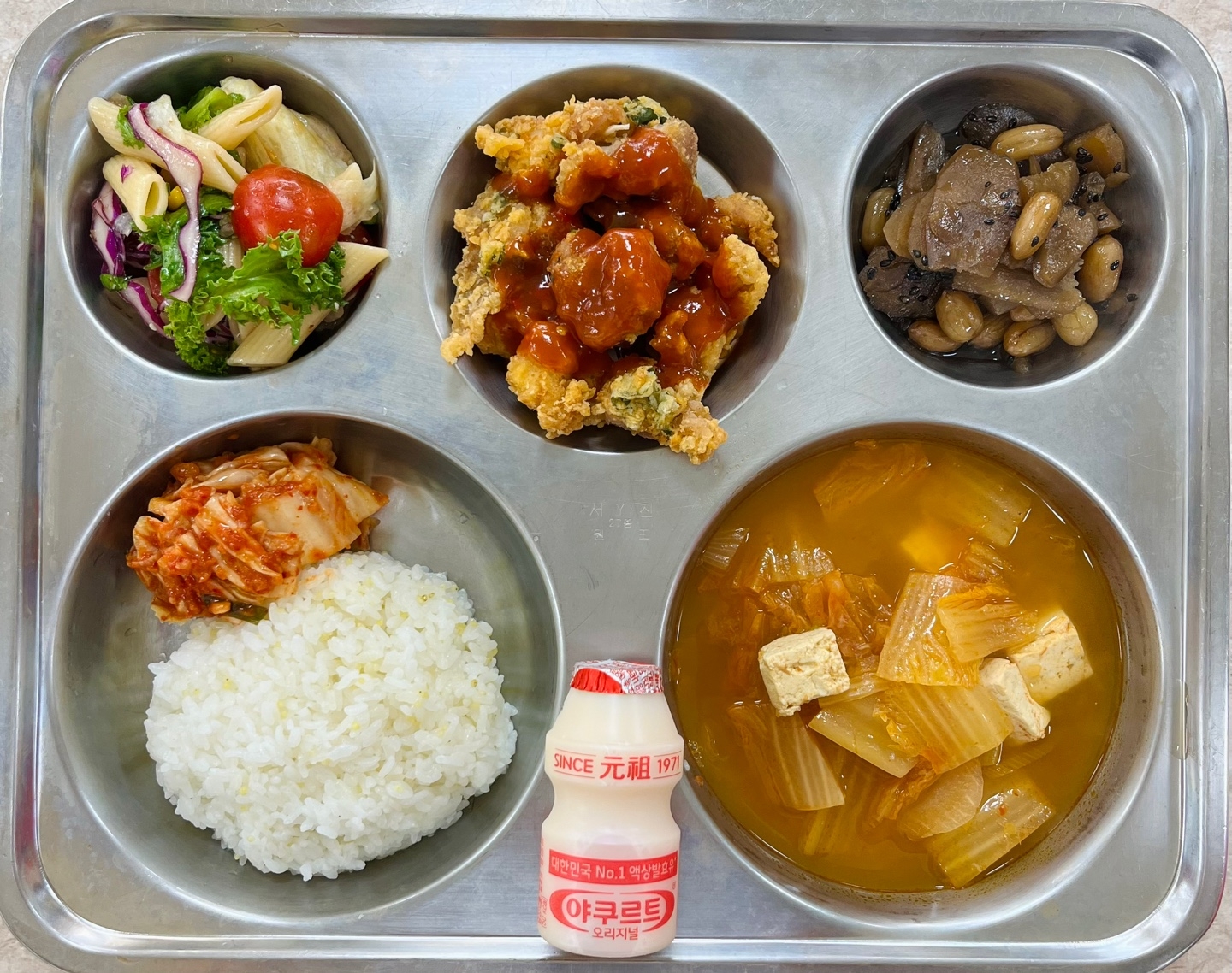 중식 : 찹쌀기장밥, 참치김치찌개, 순살깻잎치킨, 파스타샐러드, 연근땅콩조림, 배추김치, 요구르트