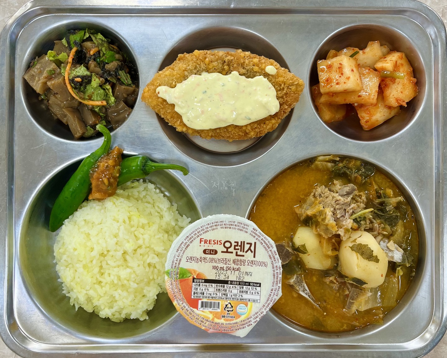 중식 : 강황밥, 돈등뼈김치알감자탕, 크런치생선까스/타르소스, 도토리묵상추무침, 모닝고추/쌈장, 나박김치, 오렌지주스