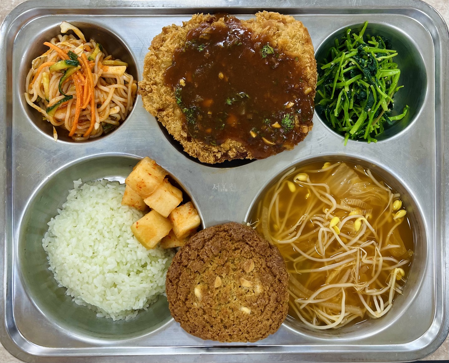 중식 : 클로렐라찹쌀밥, 김치콩나물국, 경양식돈까스, 쫄면무침, 참나물무침, 깍두기, 화이트마카다미아쿠키
