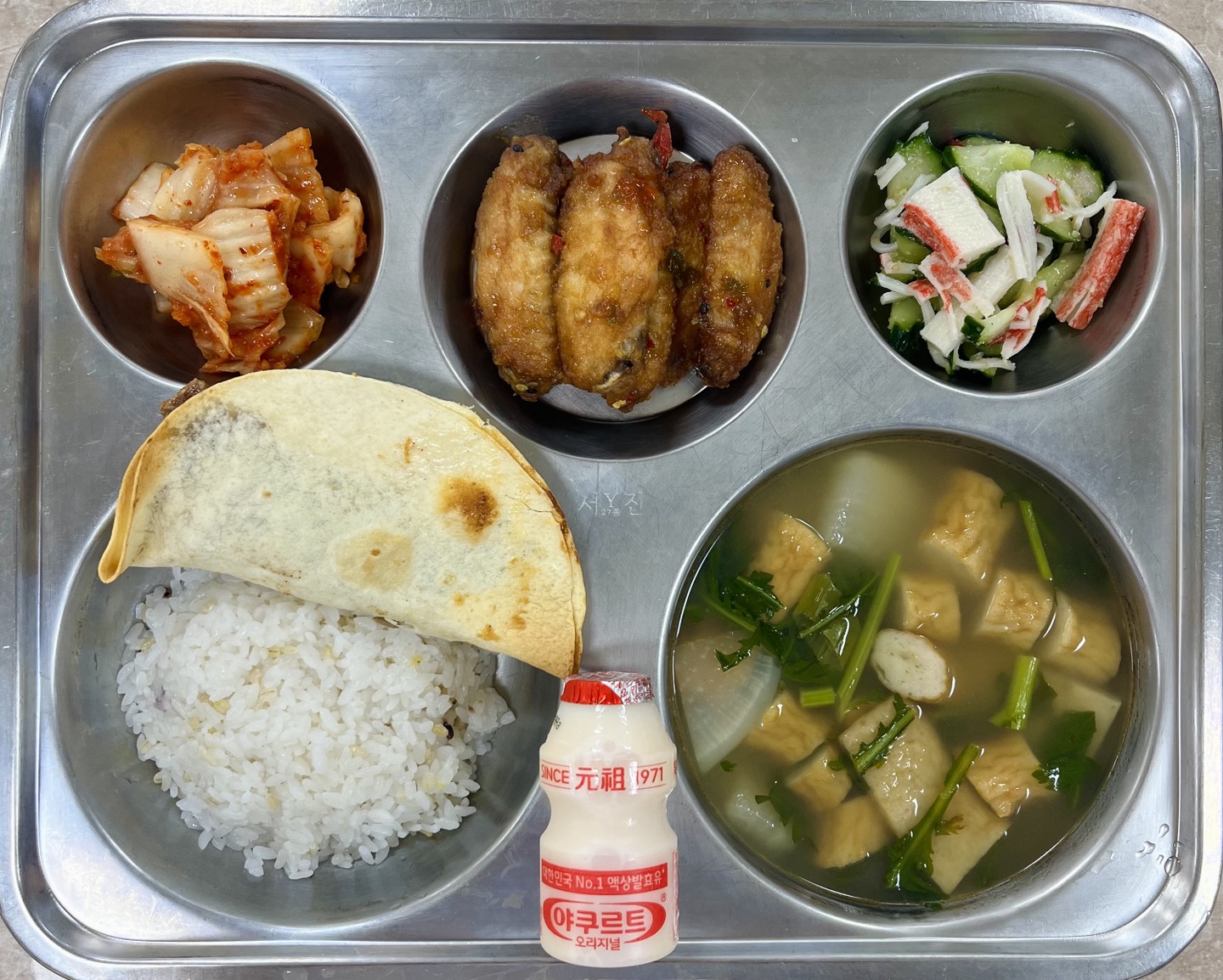 중식 : 찰혼합잡곡밥, 어묵매운탕, 닭날개간장조림, 견과류치즈호떡, 맛살오이무침, 배추김치, 요구르트