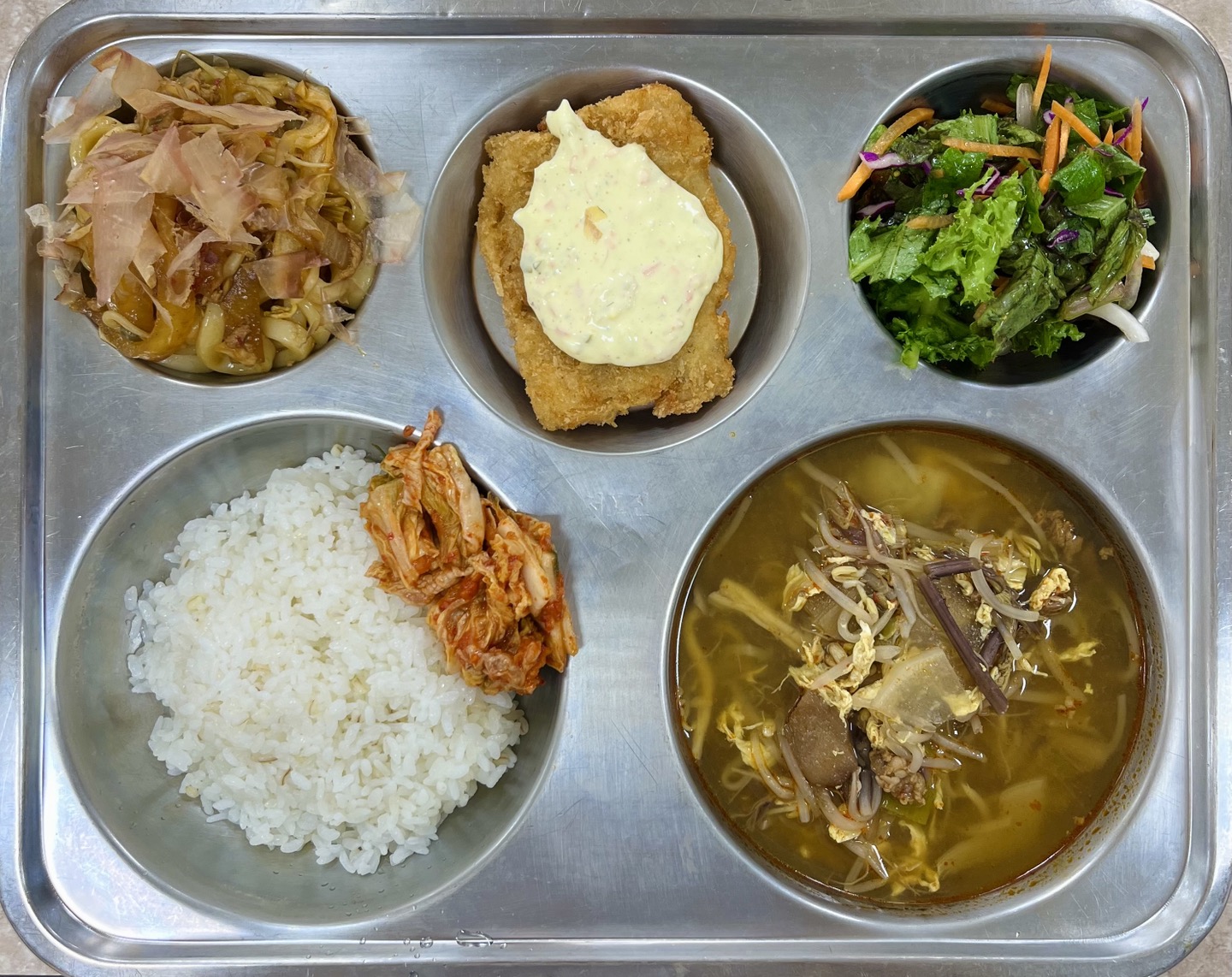중식 : 찰보리밥, 육개장, 명태까스/타르소스, 야끼우동, 새콤상추치커리무침, 배추김치