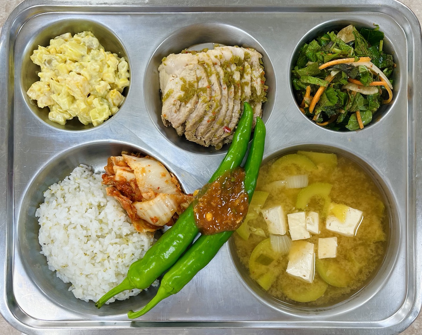 중식 : 찹쌀차조밥, 호박된장국, 오향장육, 아삭이오이고추/쌈장, 단호박고구마범벅, 한식겉절이, 배추김치