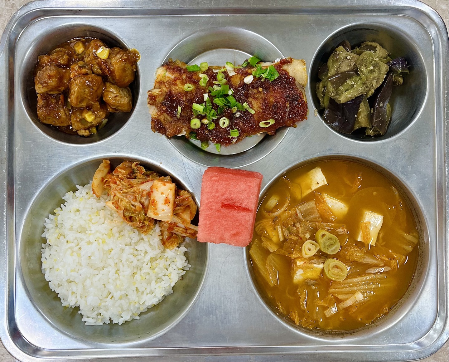 중식 : 찹쌀기장밥, 참치김치찌개, 고갈비, 미트볼조림, 가지나물, 배추김치, 수박