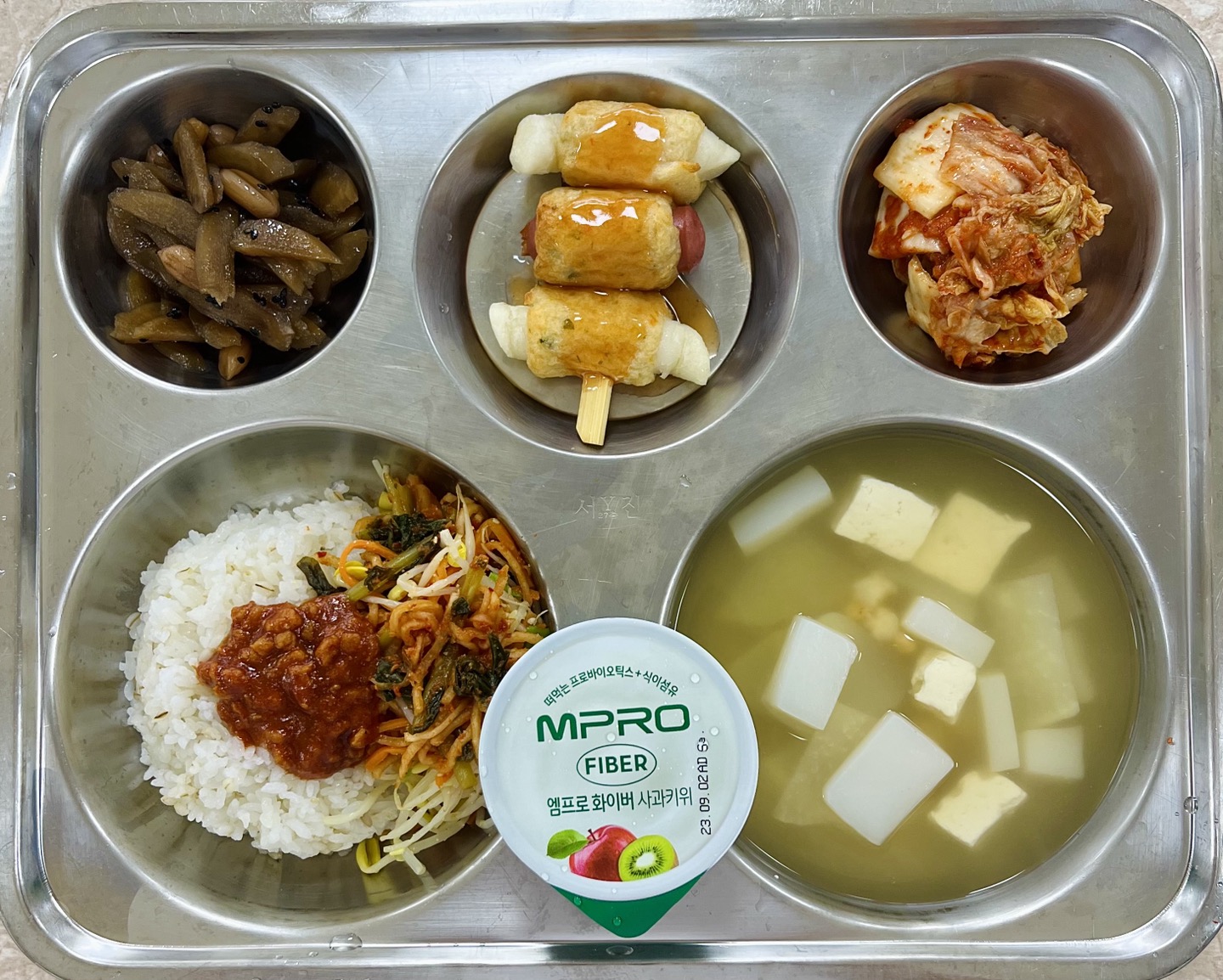중식 : 찰보리열무비빔밥, 두부탕국, 수제어묵소떡꼬치, 우엉땅콩조림, 배추김치, 떠먹는요구르트(사과키위)