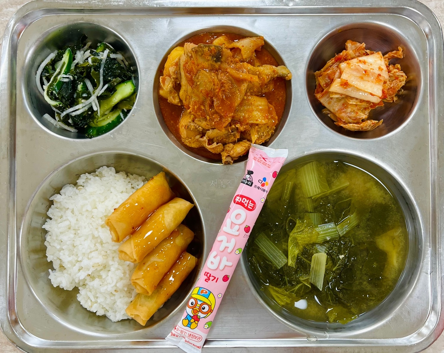 중식 : 찰보리밥, 단배추된장국, 닭김치찜, 춘권/칠리소스, 오이미역초무침, 배추김치, 짜먹는요구르트(딸기)