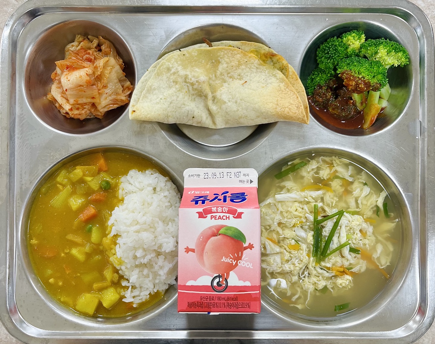 중식 : 단호박카레라이스, 표고부추달걀국, 불고기퀘사디아, 브로콜리/초고추장, 배추김치, 유산균음료(복숭아맛)