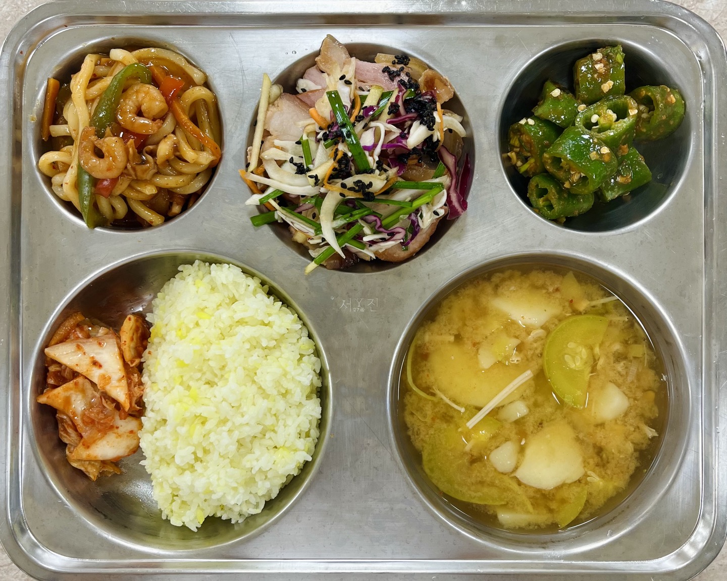 중식 : 강황밥, 감자애호박된장국, 해물우동볶음, 훈제족살무침, 오이고추맛된장무침, 배추김치