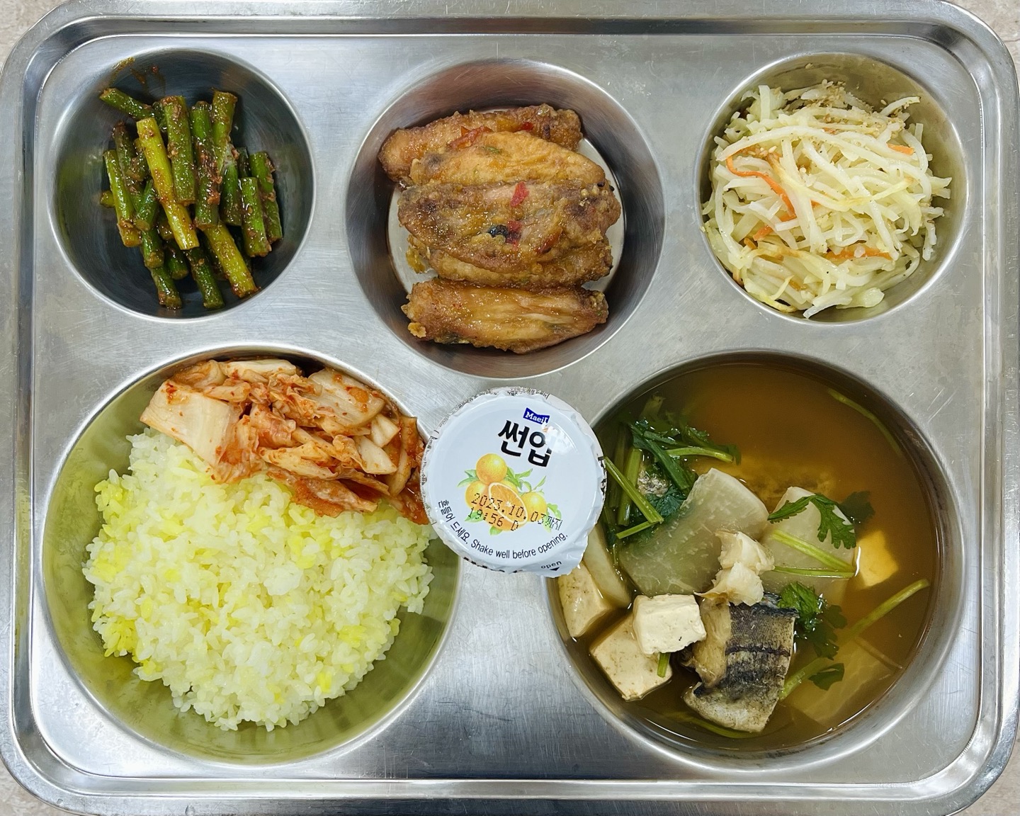 중식 : 강황밥, 동태매운탕, 닭날개간장조림, 감자채볶음, 마늘쫑고추장무침, 배추김치, 오렌지주스