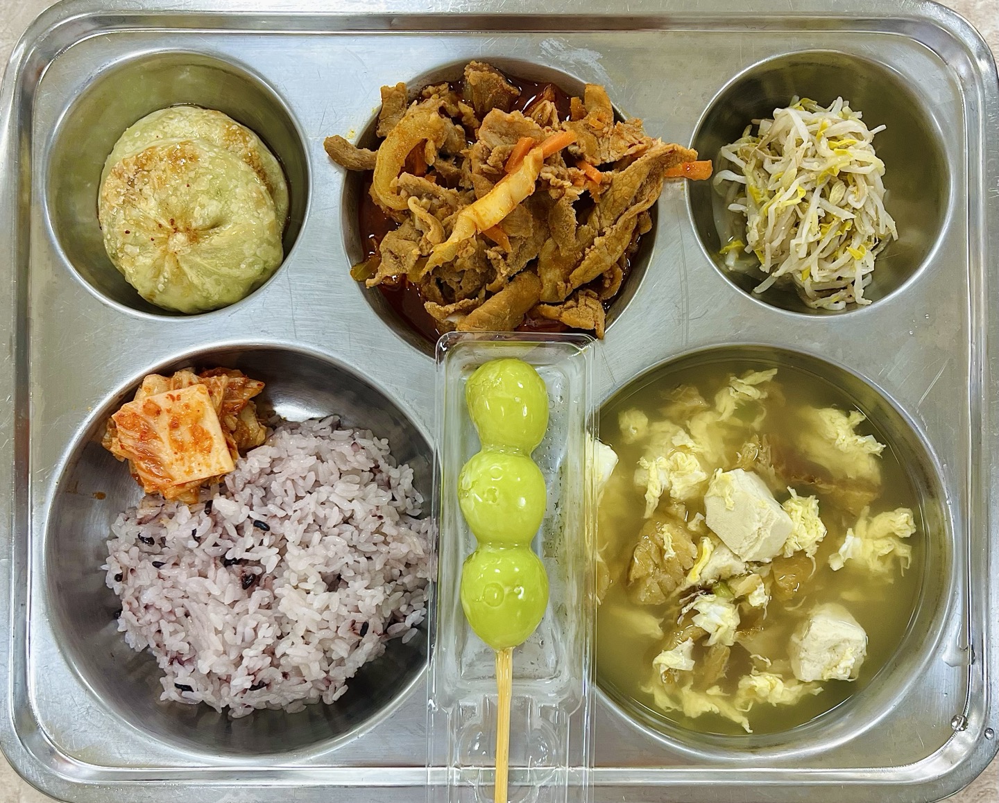 중식 : 찰흑미밥, 북어계란국, 돈육고추장불고기, 보름달군마두, 숙주나물무침, 배추김치, 샤인머스캣 탕후루