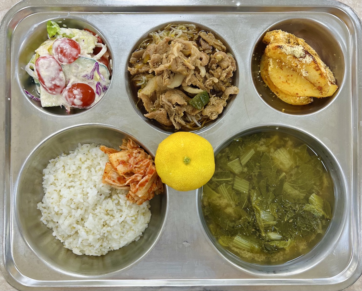 중식 : 찹쌀차조밥, 시락국, 돈육숙주볶음, 매콤웨지감자구이, 양상추참깨샐러드, 배추김치, 귤