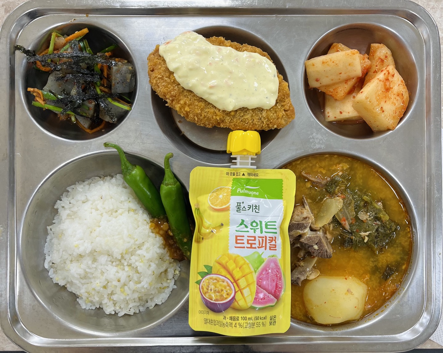 중식 : 찹쌀기장밥, 돈등뼈김치알감자탕, 크런치생선까스/타르소스, 올방개묵무침, 모닝고추/쌈장, 나박김치, 스위트트로피컬주스