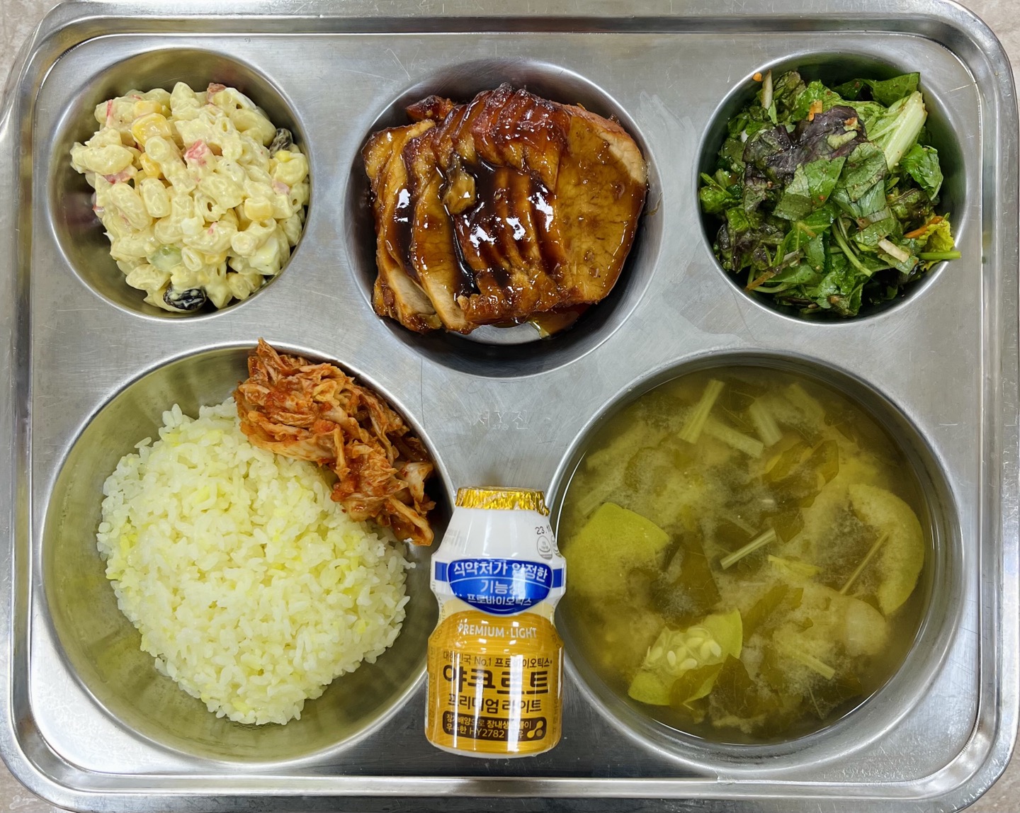 중식 : 강황밥, 열무된장국, 흑돼지바비큐구이, 마카로니샐러드, 한식겉절이, 배추김치, 요구르트