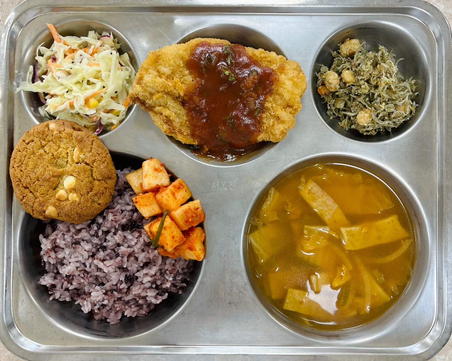 중식 : 찰흑미밥, 김치어묵국, 왕등심돈가스, 양배추샐러드/키위드레싱, 찹쌀콩명치볶음, 화이트마카다미아쿠키, 깍두기