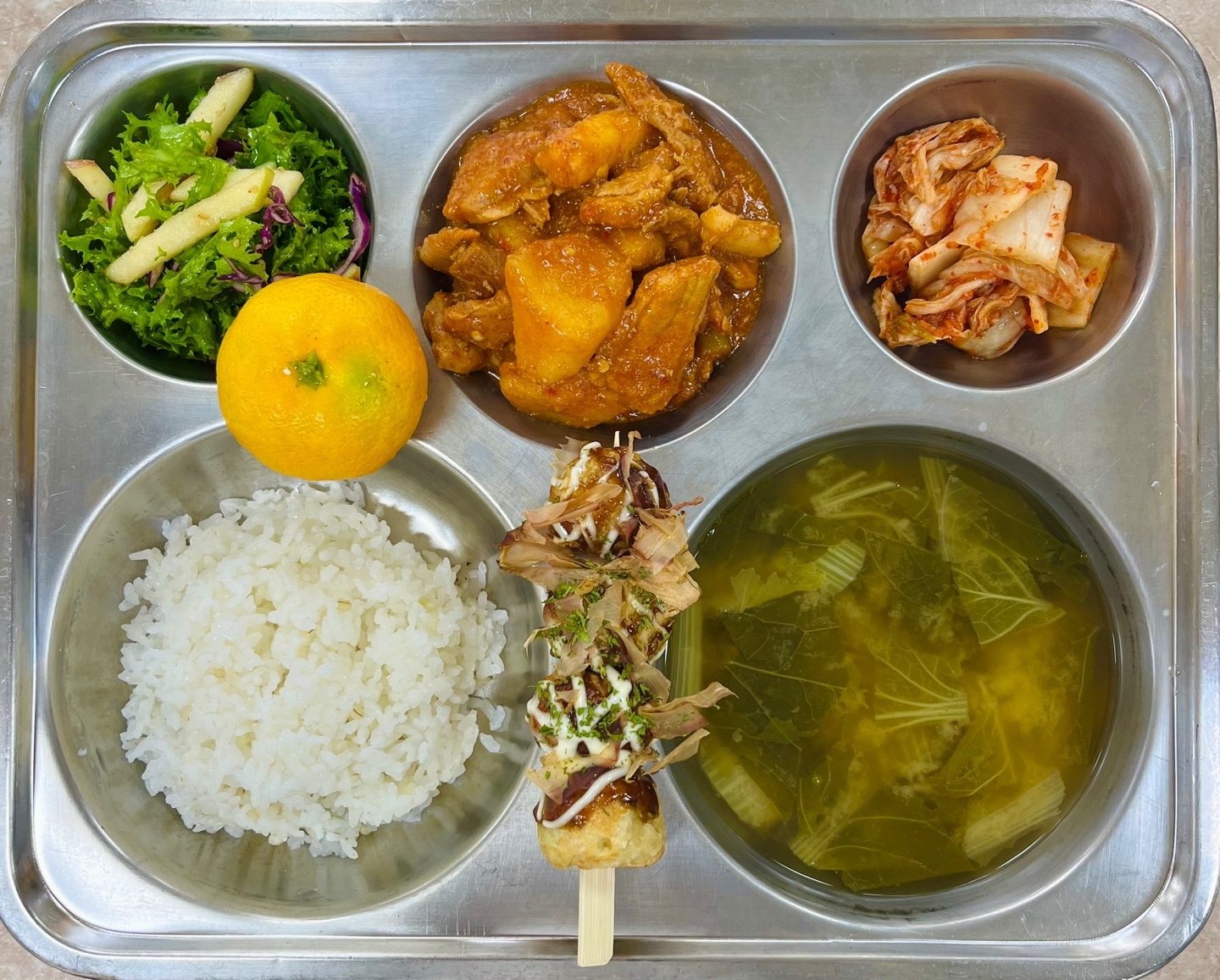 중식 : 찰보리밥, 시락국, 매운돼지갈비찜, 다코야끼꼬치, 치커리유자청무침, 배추김치, 귤
