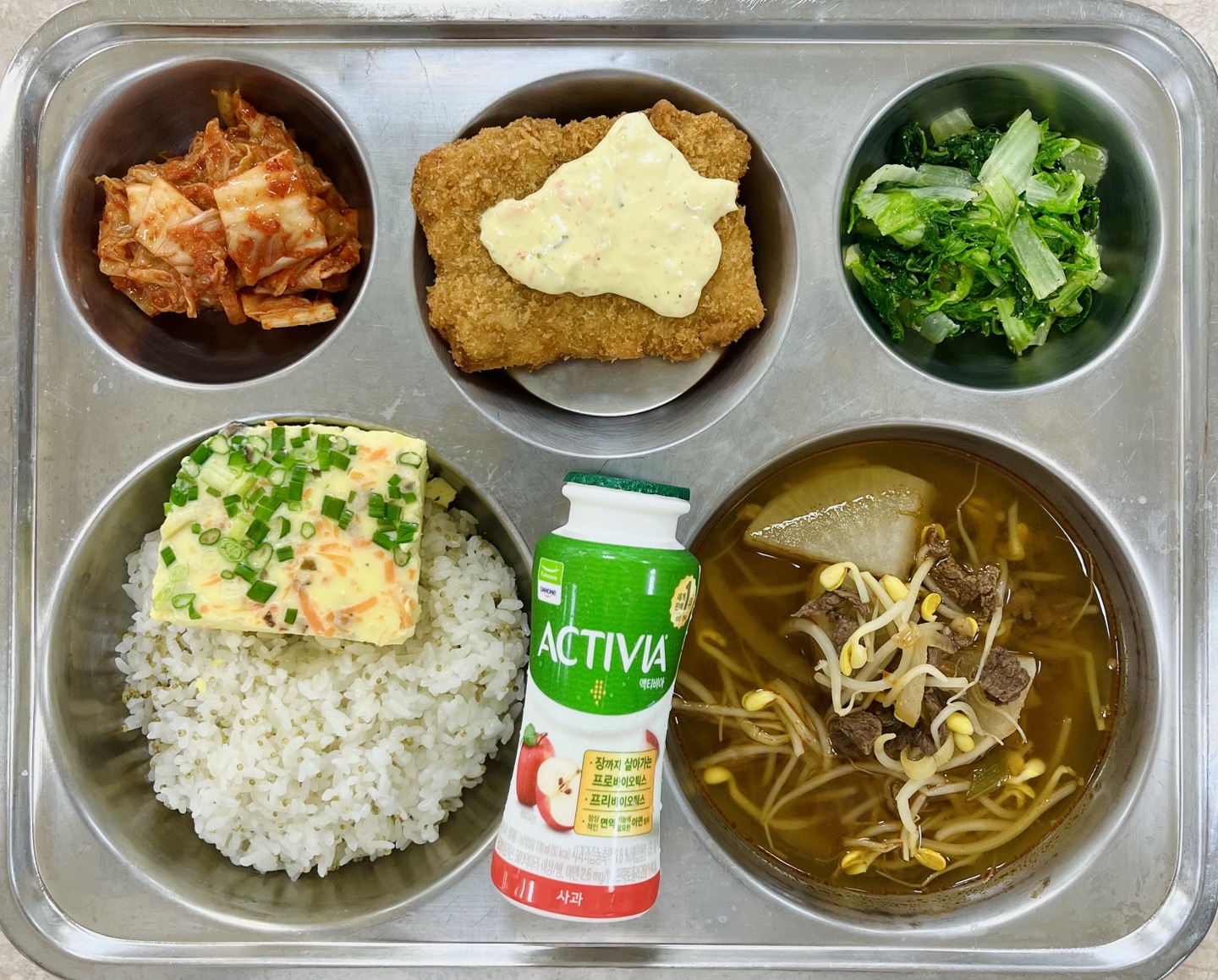 중식 : 찹쌀차조밥, 쇠고기국, 명태까스/타르소스, 달걀찜, 단배추나물, 배추김치, 요구르트(사과)