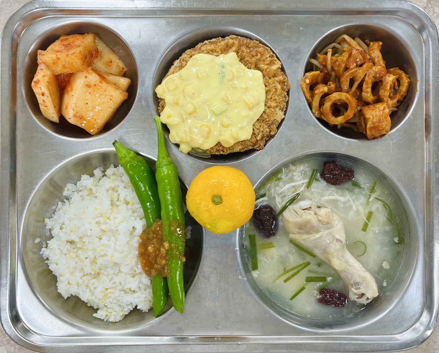 중식 : 찹쌀기장밥, 누룽지닭다리삼계탕, 새우가스/콘드레싱, 어묵콩나물찜, 나박김치, 귤