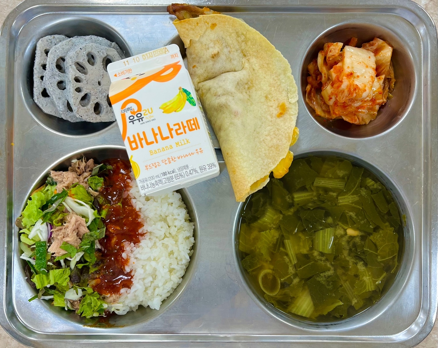 중식 : 참치비빔밥, 시락국, 불고기퀘사디아, 연근흑임자소스무침, 배추김치, 바나나우유
