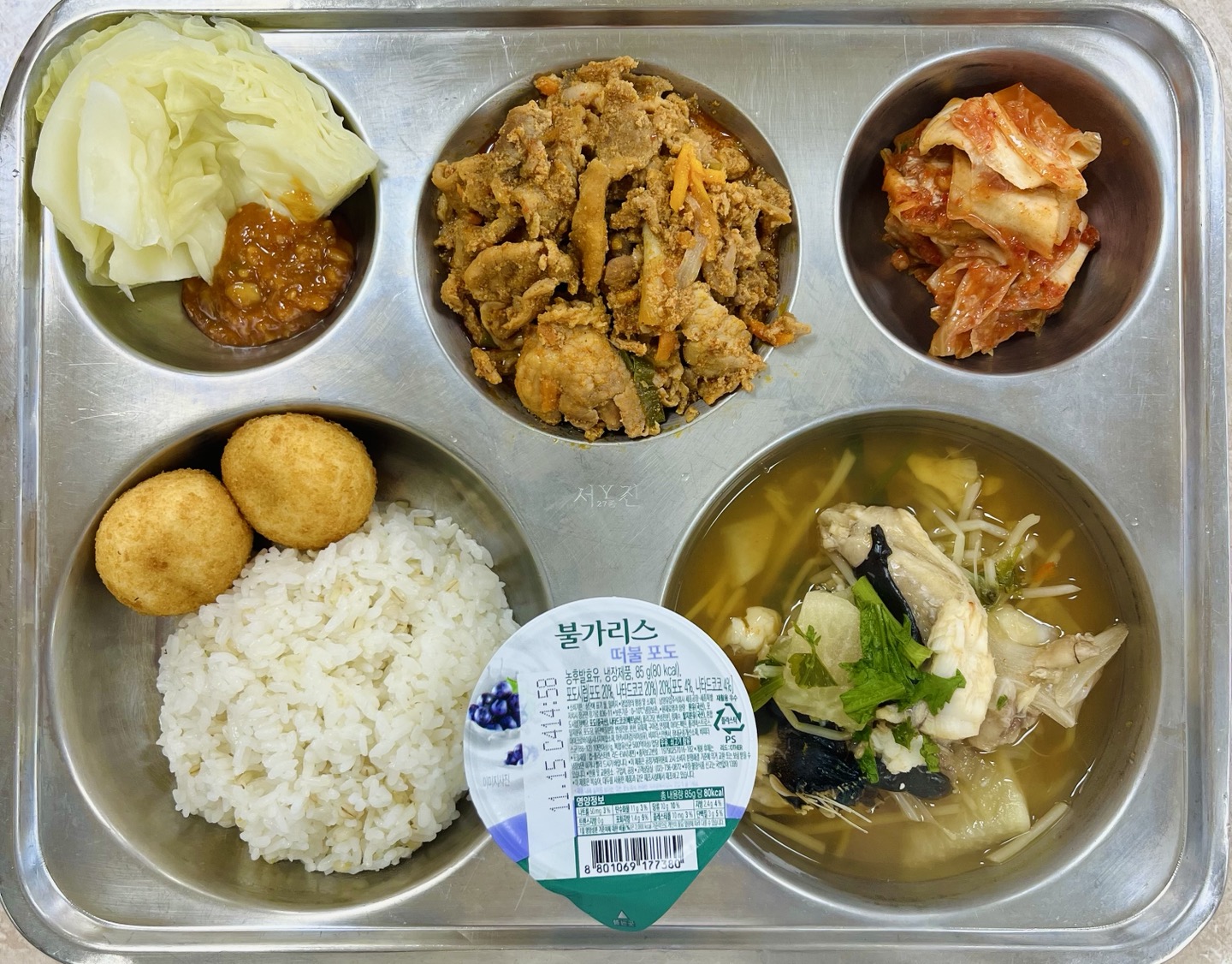 중식 : 찰보리밥, 아귀탕, 돈육고추장불고기, 치즈볼, 양배추쌈/쌈장, 배추김치, 떠먹는요구르트(포도)