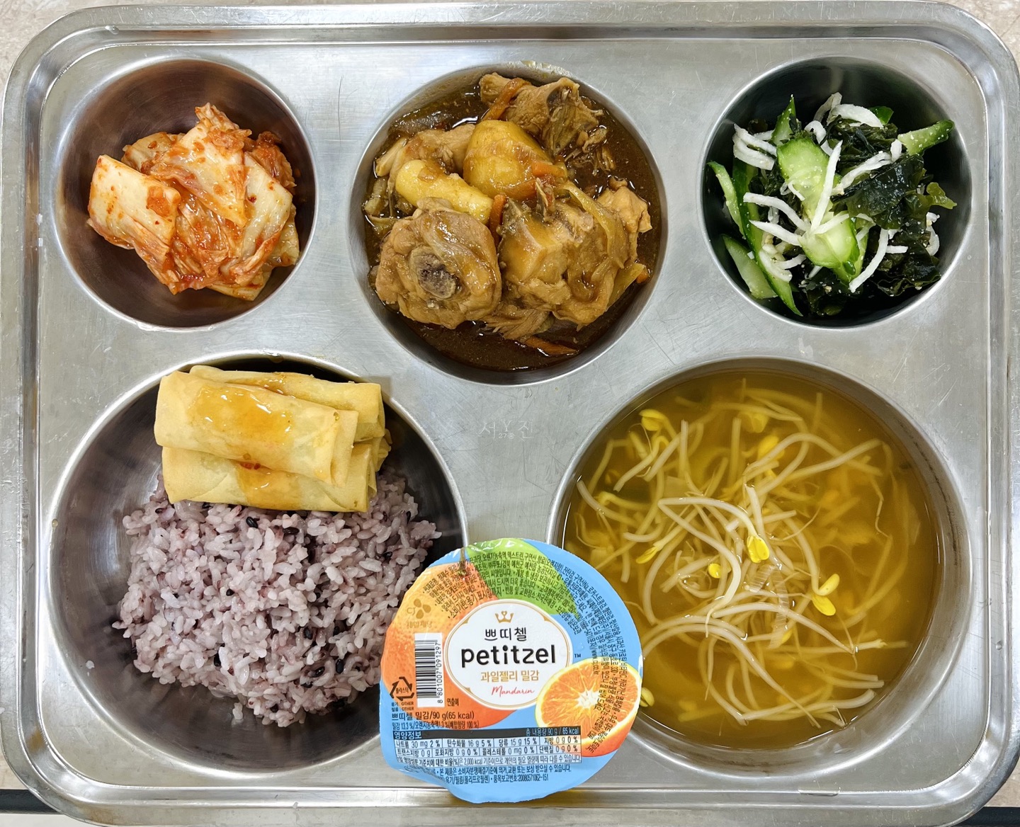 중식 : 찰흑미밥, 매콤콩나물국, 숯불조림닭, 춘권/칠리소스, 오이미역초무침, 배추김치, 과일젤리(밀감)