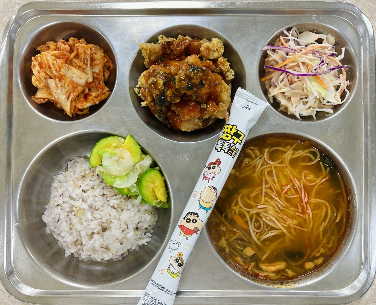 중식 : 찰혼합잡곡밥, 순살깻잎치킨, 양배추샐러드/아일랜드드레싱, 애호박새우젓볶음, 배추김치, 초코스틱