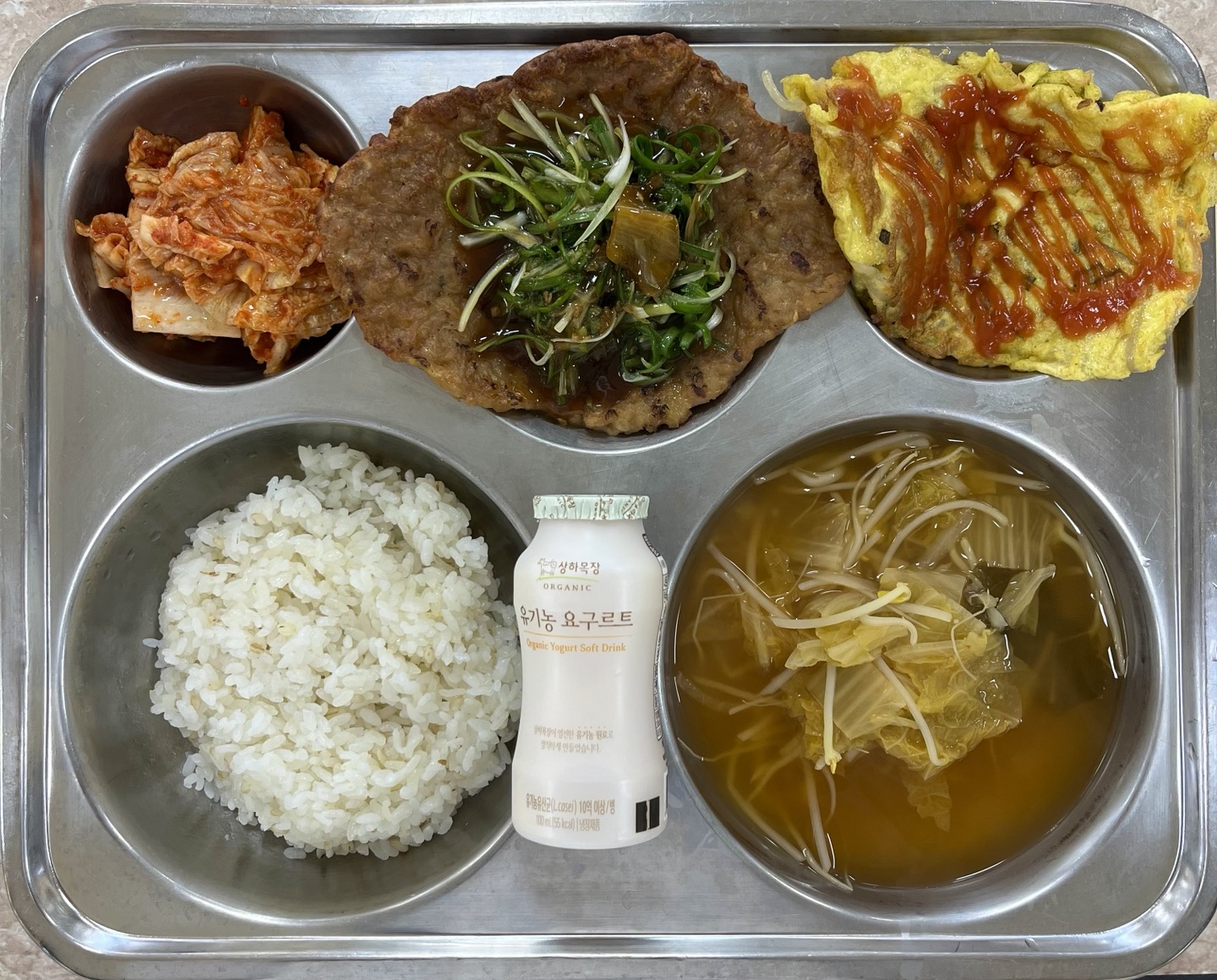중식 : 찰보리밥, 김치콩나물국, 언양식불고기/파채무침, 달걀만두, 배추김치, 유기농요구르트