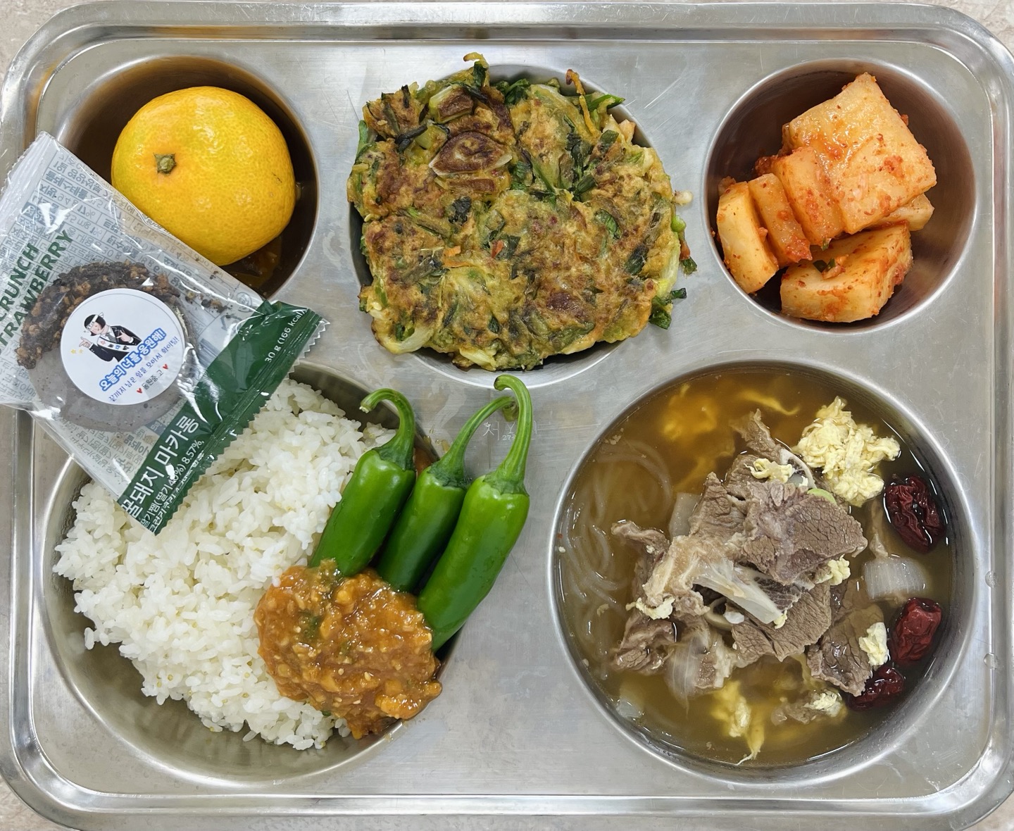 중식 : 찹쌀차조밥, 한우갈비탕, 해물파전, 모닝고추/쌈장, 나박김치, 돼지마카롱, 귤