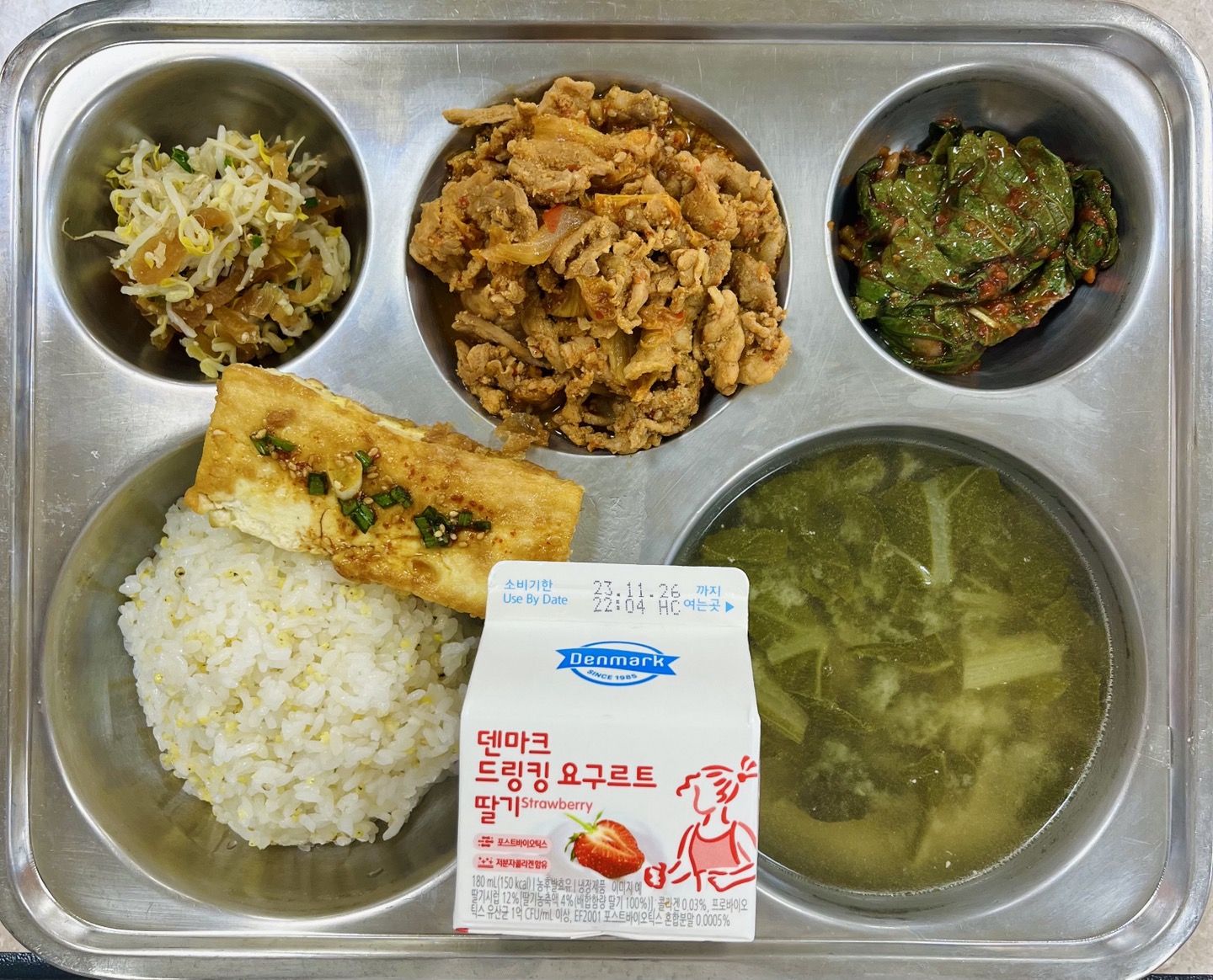 중식 : 찹쌀기장밥, 근대된장국, 돈육김치볶음, 두부달걀전, 숙주무장아찌무침, 깻잎김치, 드링크요구르트