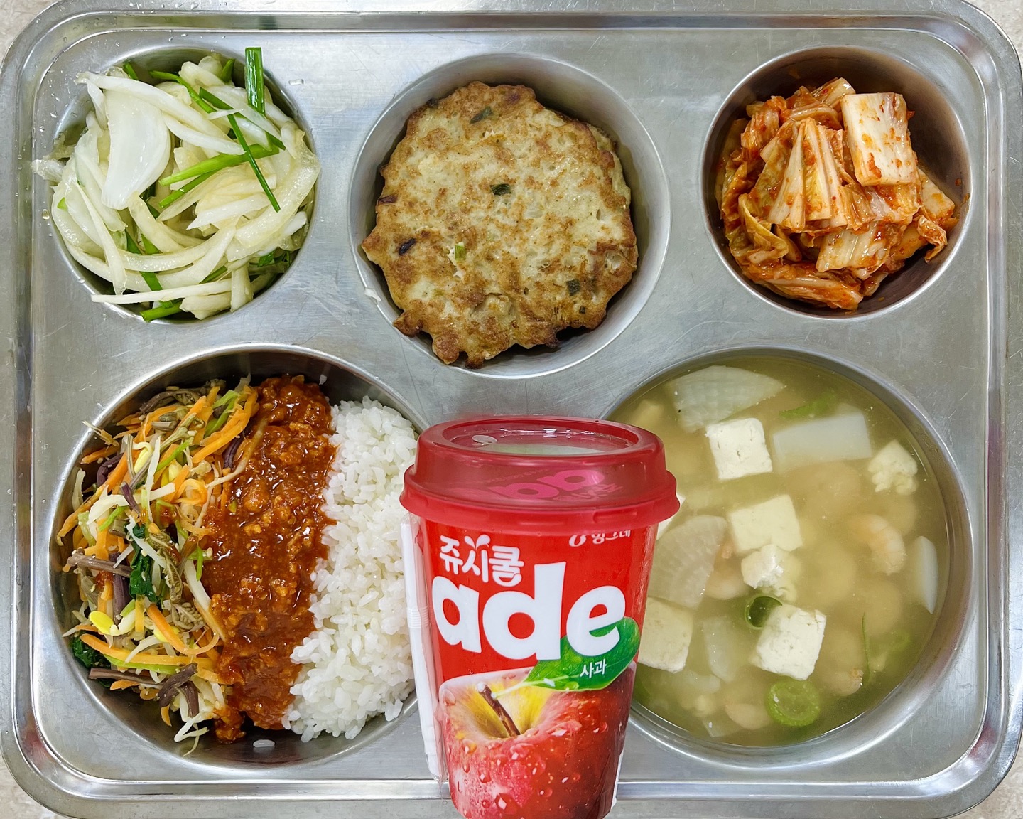 중식 : 나물비빔밥, 두부탕국, 고기지짐전, 새콤양파절임, 배추김치, 유산균음료에이드(사과)