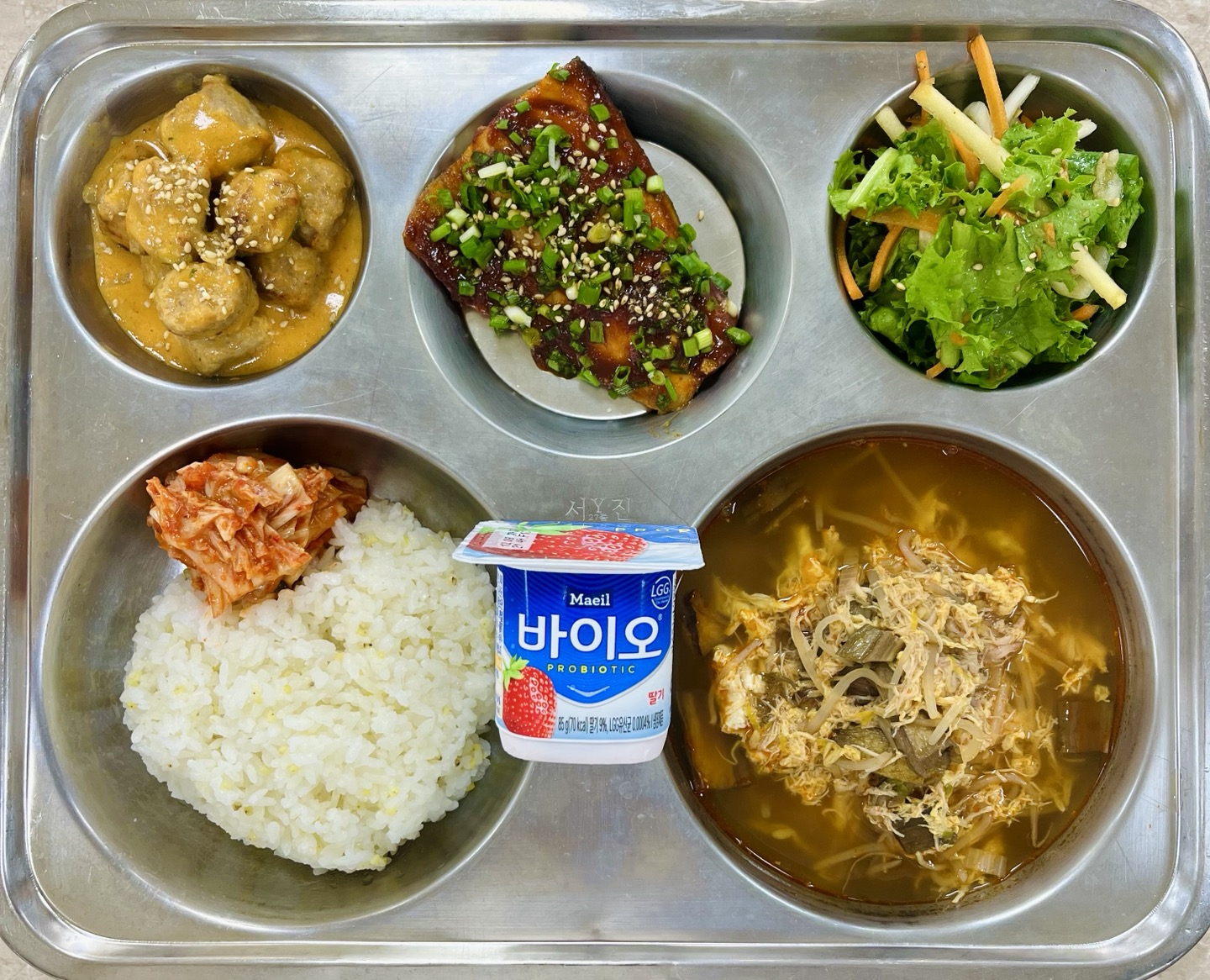 중식 : 찹쌀기장밥, 닭개장, 고갈비, 로제소스미트볼조림, 치커리사과무침, 배추김치, 떠먹는요구르트(딸기)