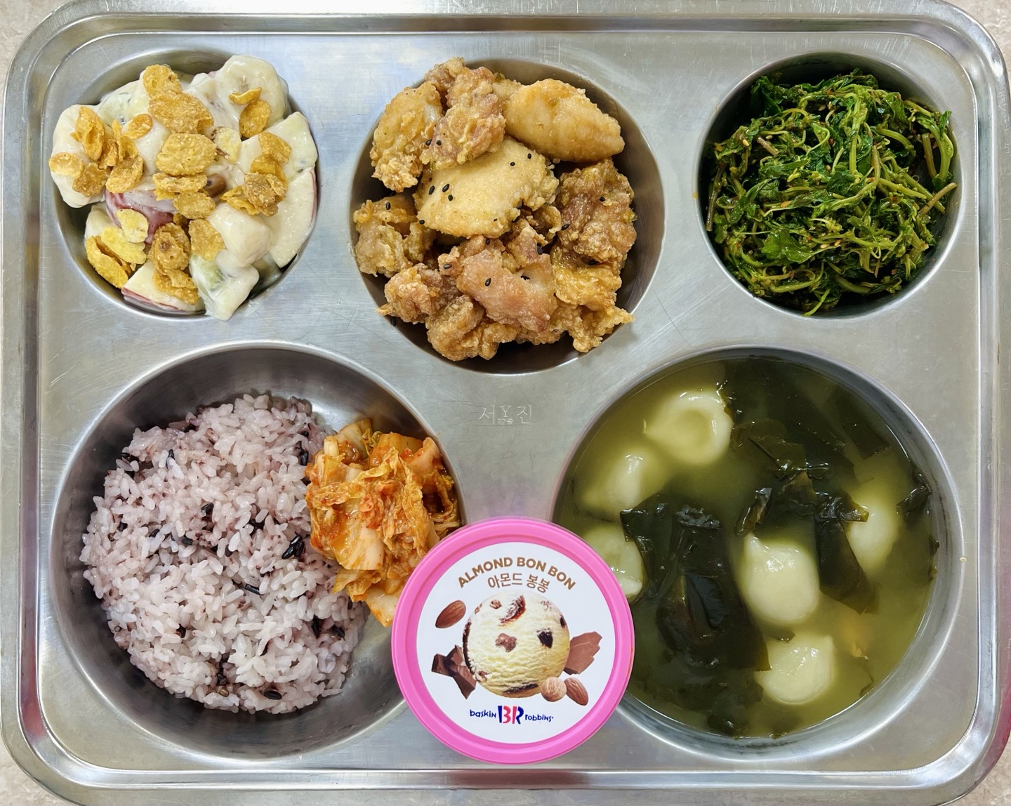 중식 : 찰현미밥, 새알심만두미역국, 허니킹치킨, 시리얼과일샐러드, 비름나물, 배추김치, 아몬드봉봉
