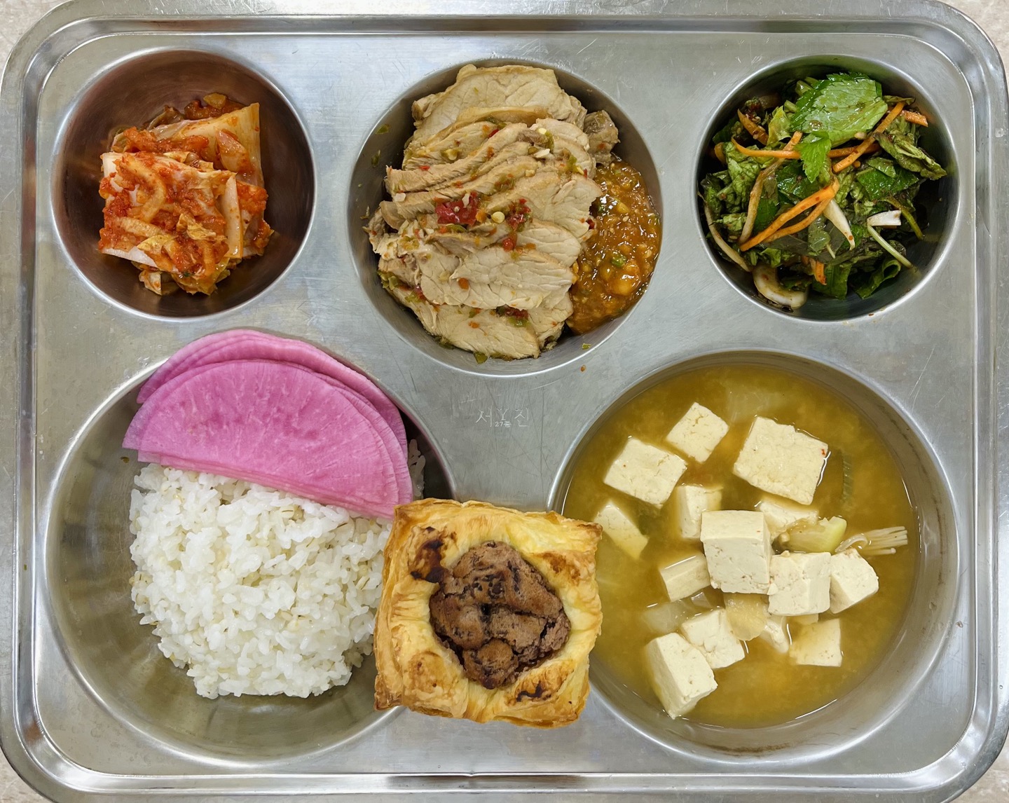 중식 : 찰보리밥, 오향장육, 두부된장국, 한식겉절이, 쌈장, 블루베리무쌈, 배추김치, 황금파이만주