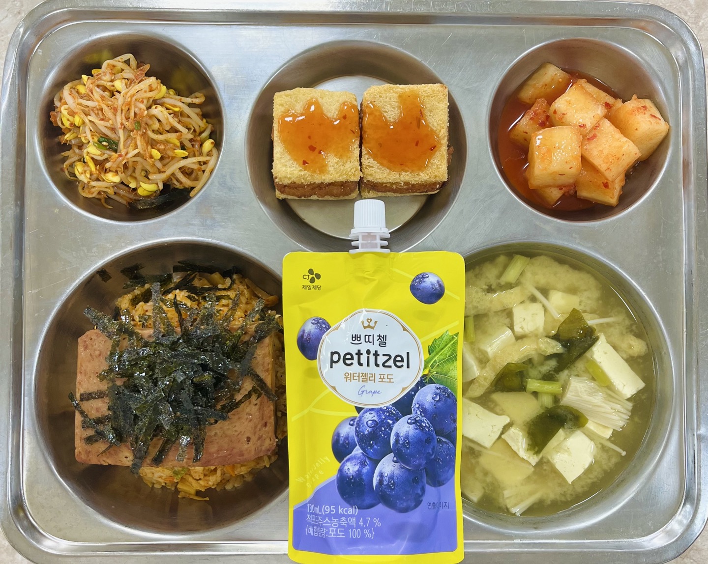 중식 : 통스팸김치볶음밥, 미소장국, 멘보샤, 콩나물무침, 깍두기, 포도드링크