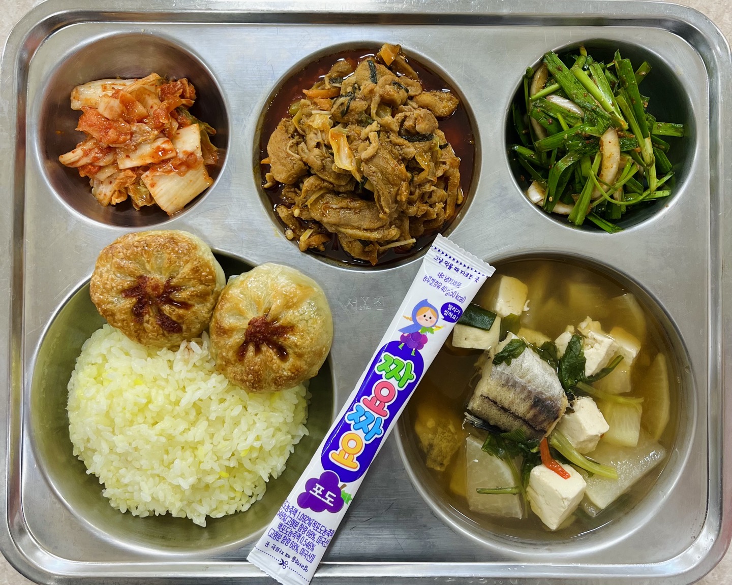 중식 : 강황밥, 동태매운탕, 오리불고기, 보름달군만두, 부추겉절이, 배추김치, 짜먹는요구르트(포도)