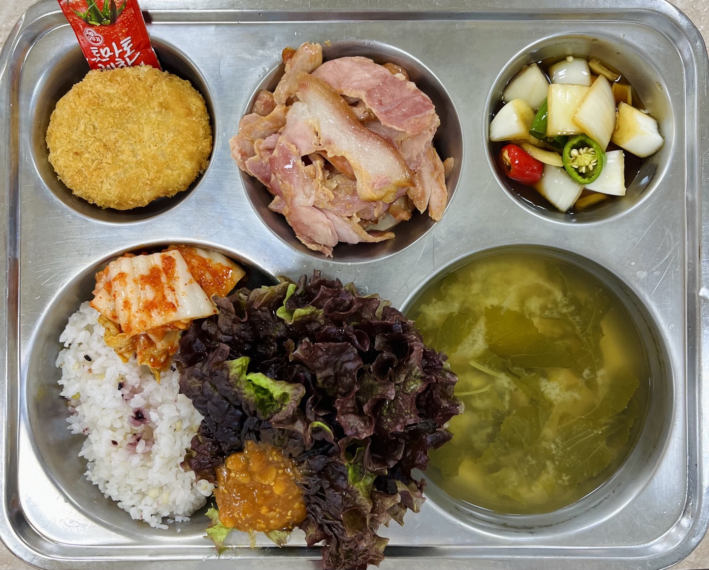 중식 : 찰혼합잡곡밥, 열무된장국, 훈제족살, 수제감자크로켓, 양파고추장아찌, 상추쌈/쌈장, 배추김치