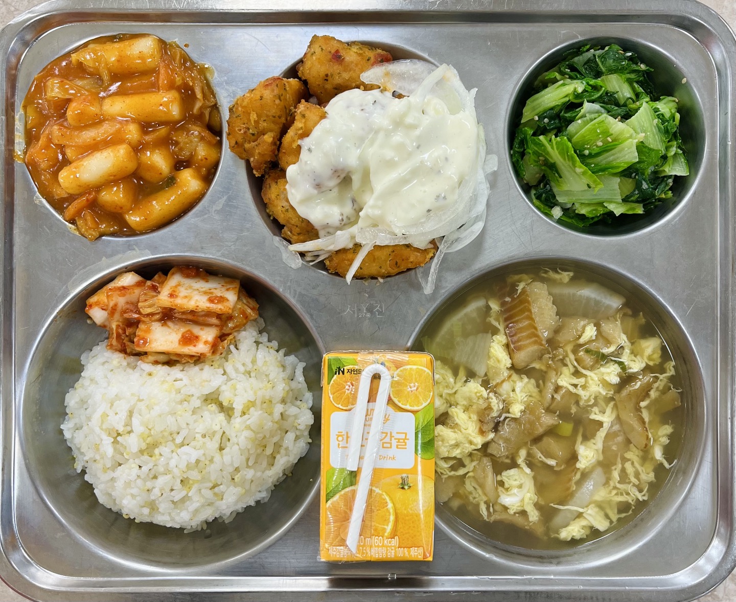 중식 : 찹쌀기장밥, 북어국, 고추송송어니언치킨, 떡볶이, 단배추나물, 배추김치, 감귤한모금
