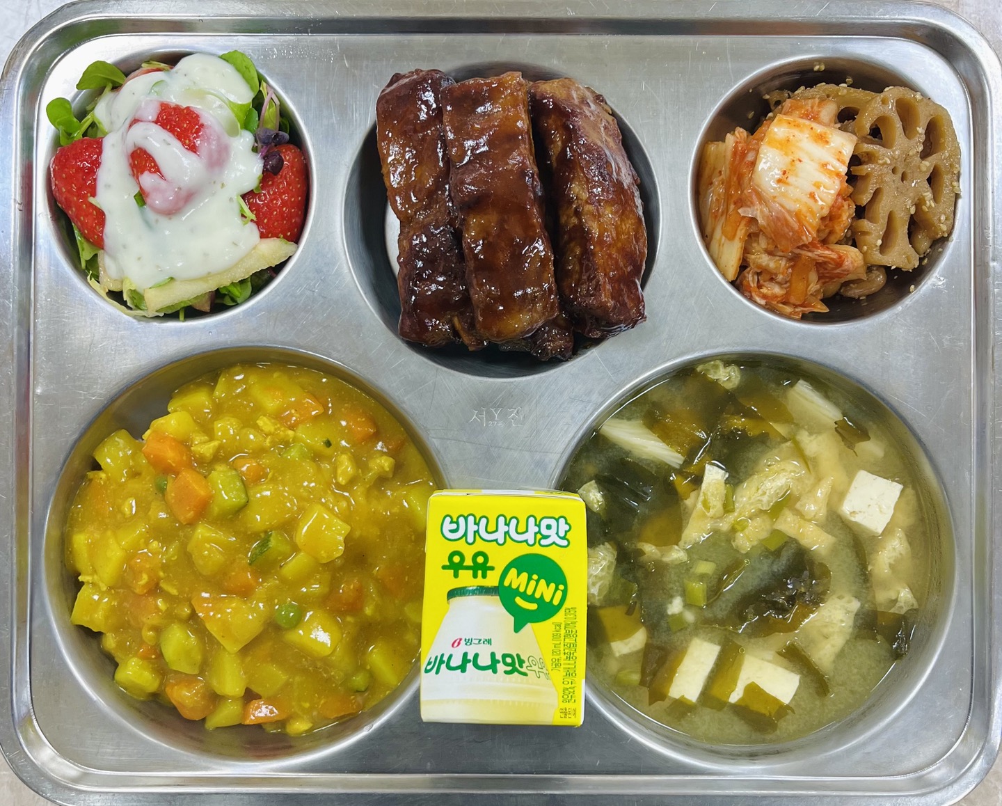 중식 : 카레라이스, 미소장국, 바비큐폭립, 딸기어린잎샐러드, 연근땅콩조림, 배추김치, 바나나라떼