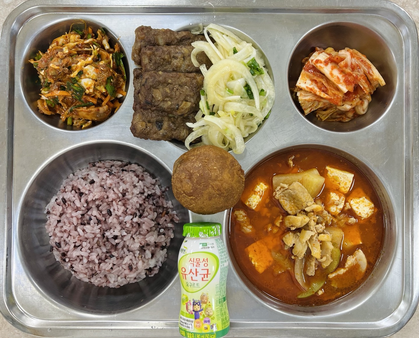 중식 : 찰흑미밥, 돈육된장찌개, 버섯떡갈비와 새콤양파샐러드, 꼬막살무침, 찹쌀도넛, 배추김치, 요구르트