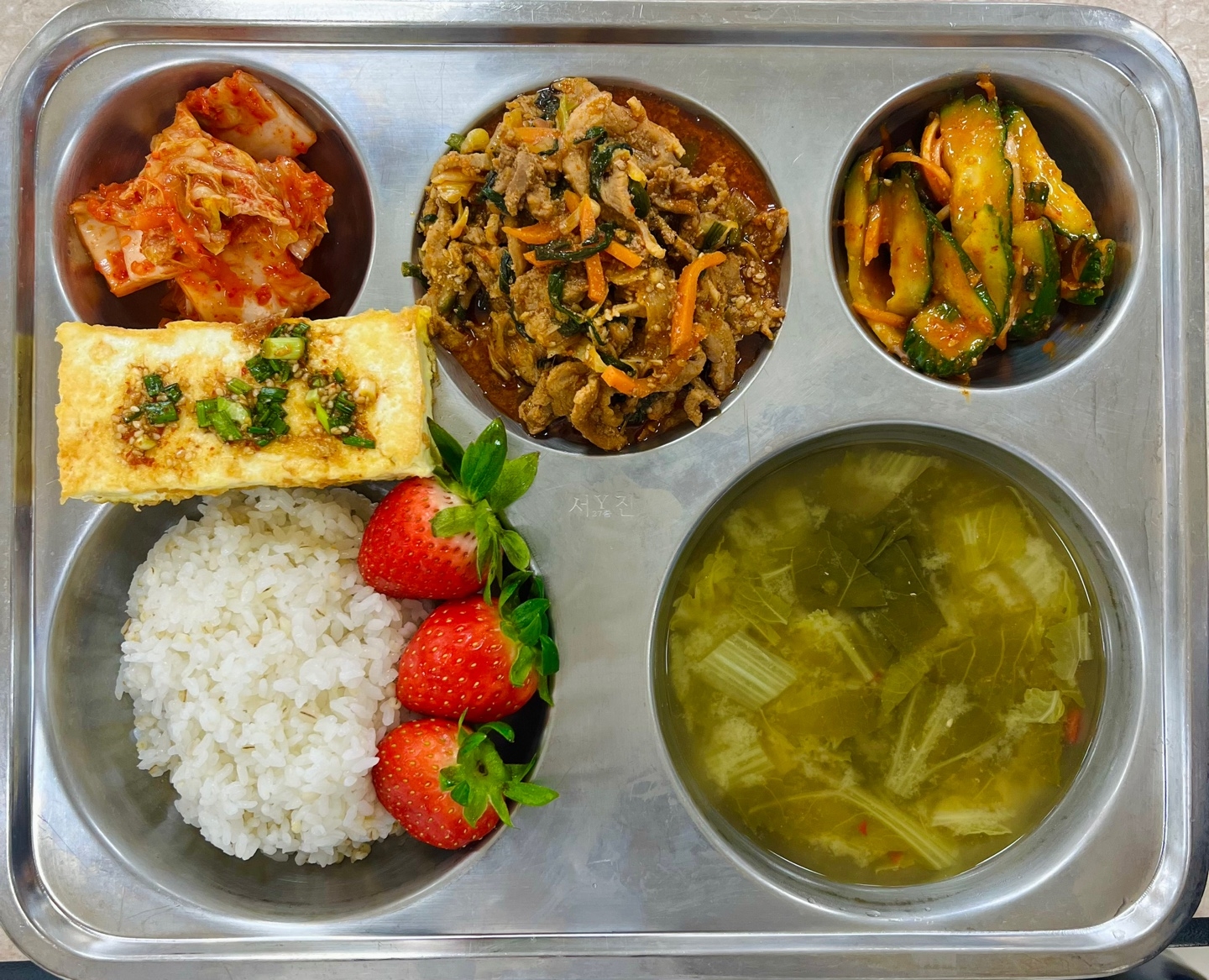 중식 : 찰보리밥, 시락국, 오리불고기, 두부달걀전, 오이도라지무침, 배추김치, 딸기