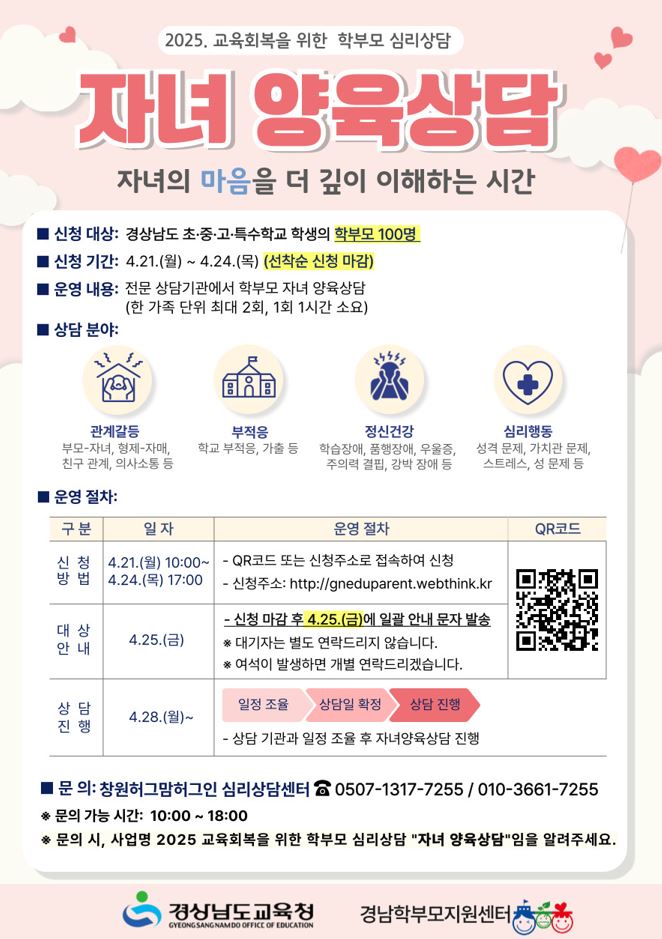 2025. 교육회복을 위한 학부모 심리상담 "자녀 양육상담" 안내